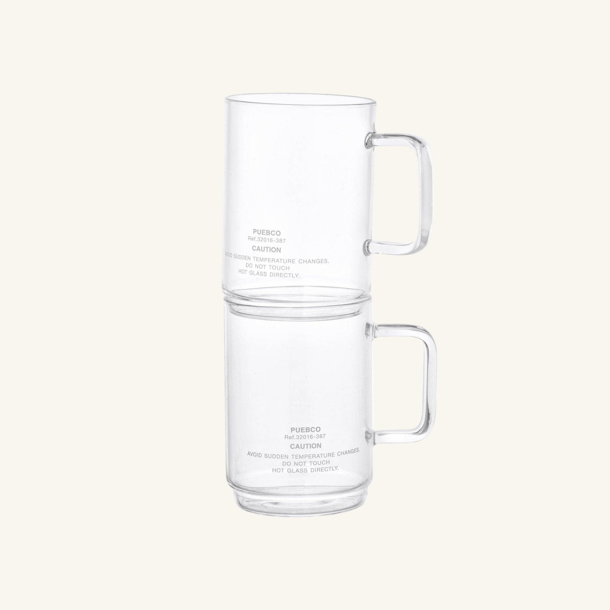 Enjoy your favorite drink - hot or cold - in this stacking mug from Puebco. Crafted from premium borosilicate glass, it is resistant to extreme temperatures and more durable than standard glassware. The "shallow" version has a small, rounded handle, the "deep" version has an angular handle and both have a tiered design which makes them easily stackable to save space when storing in your cupboards.