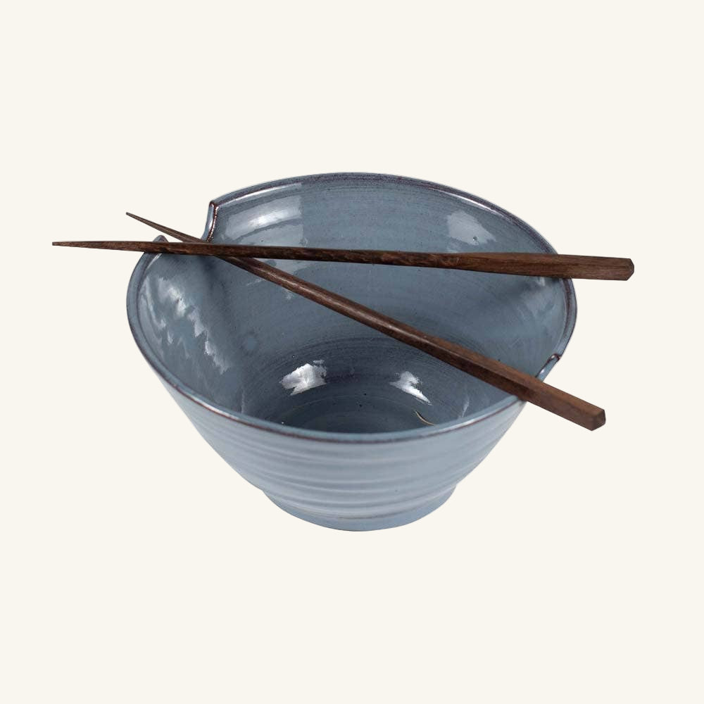 Never misplace your chopsticks with this special bowl! Handcrafted with two grooves on the rim where chopsticks can rest, this bright blue terracotta bowl is made by artisans working with Sana Hastakala in Nepal. Chopsticks included!