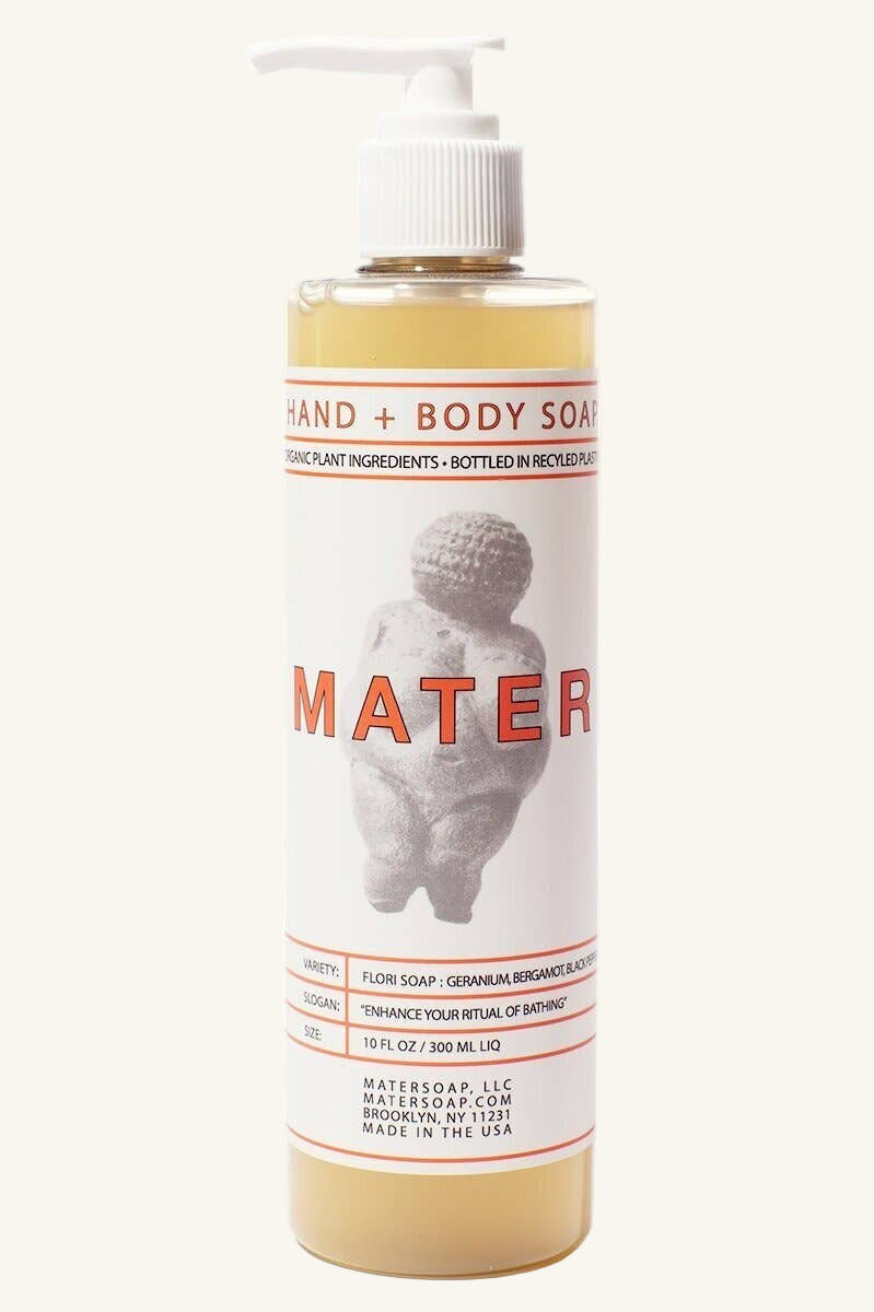 Mater Hand + Body soap is true soap made with organic and sustainably harvested plant-based ingredients: no parabens, sulfates, dyes, fragrances, foaming agents, or synthetics.