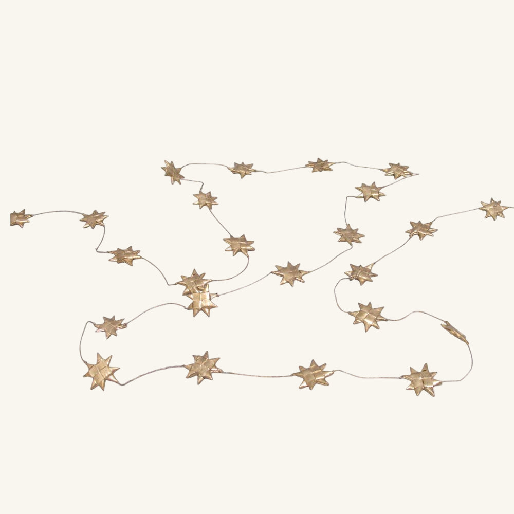 Holiday gold garland showcases handmade palm leaf stars bound on a cord. The length of these garlands varies from 13 to 14 feet. Palm leaf stars are 1" in diameter - strands are 13 to 14 feet long - Made in Bangladesh
