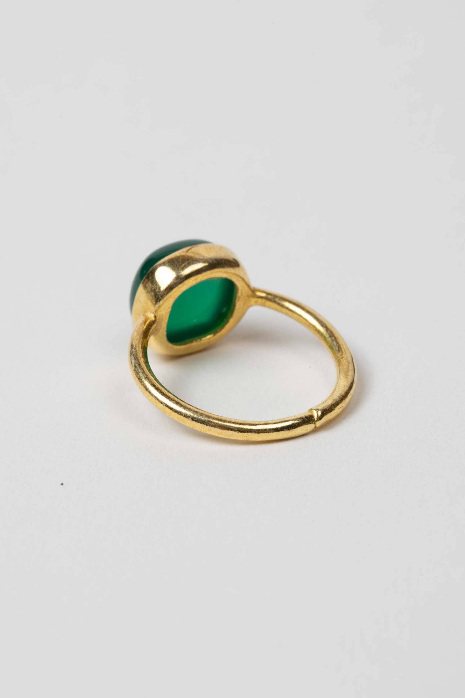 Gold⁃colored brass metal ring with a green onyx stone - Adjustable - Stone: 0.4Wx0.4H inches, Inner diameter: 0.6⁃0.75 inches - Handcrafted in India