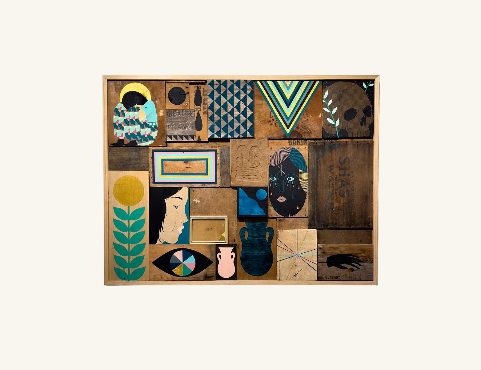 Adrian Landon Brooks (born 1983) studied painting at the San Francisco Art Institute and currently lives and works in Austin, Texas. Brooks works predominantly in the mediums of painting and illustration, often utilizing found materials such as wood, metal, and antique photographs as his unique canvases. He has exhibited extensively throughout the United States and internationally, notably with Antonio Colombo Gallery and Andenken Gallery. In addition to his gallery work, Brooks has also completed large-scale installations and murals for prominent companies such as Meta, Google, and Indeed. His work has been featured in leading art publications including Juxtapoz, VNA, Art Maze Mag, and the West #126 issue of New American Paintings.