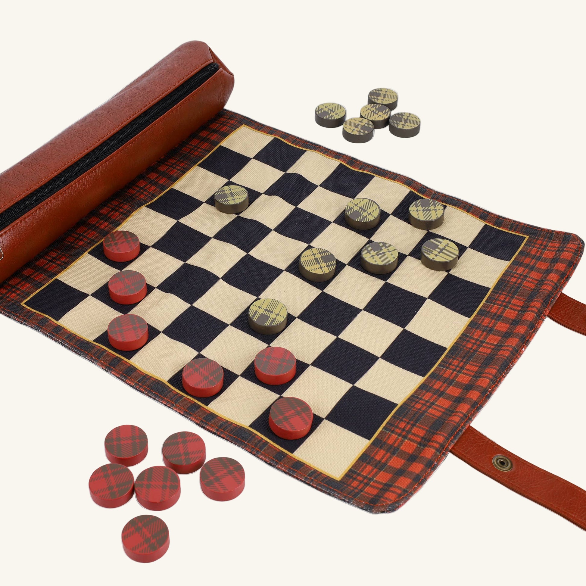 Enjoy classic board games on the go with this travel-friendly Pendleton Red Black Check Chess & Checkers set. Includes 32 reversible wooden game pieces and a canvas board that can be rolled up for easy transport. Instructions included.
