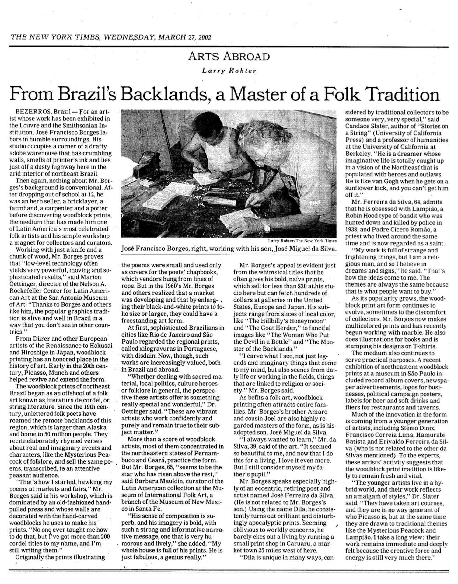 Small Original, Signed Wood Block Print by J. Borges. Each print was hand made in North East Brazil. José Francisco Borges is a distinguished Brazilian poet and woodcut artist, born in 1935 in the small town of Bezerros, Pernambuco. He taught himself to make woodcut prints to put on the cover of his booklets, "Literatura de Cordel" or "Stories on a String" which were often suspended on lines in outdoor market booths. These graphic images increased the appeal of his booklets. J. Borges has been widely recognized as a master folk artist and is represented in the collections of several museums in the U.S., Europe and Brazil.