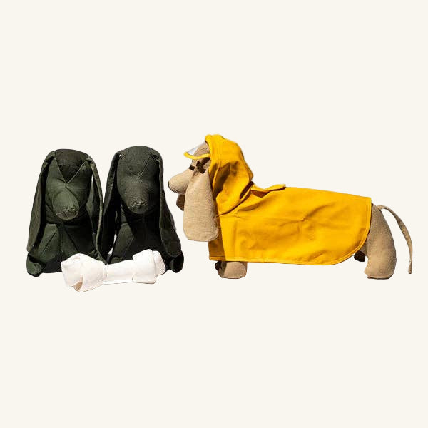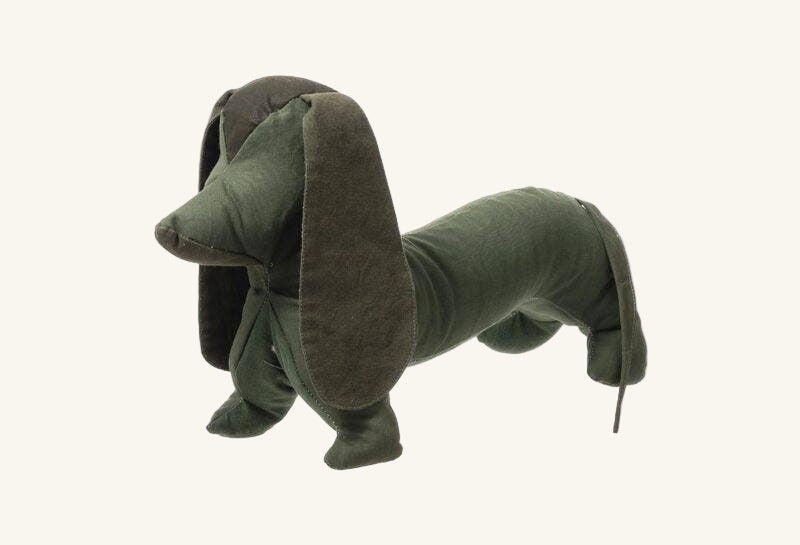 Crafted from upcycled vintage fabrics, this stuffed animal brings a charming, nostalgic element to any space. Offered by Puebco, the toy features a recycled cotton blend in a subtle patchwork style. Ideal for those who appreciate minimalist design with a playful twist. Originating from India, available as a dog (approx. 17 in.) in 4 colors: dark grey, light grey, khaki, olive green, and black. Materials include repurposed cotton and recycled fibers. Due to its vintage nature, the fabric may show signs of wear such as tears, stains, and fading.