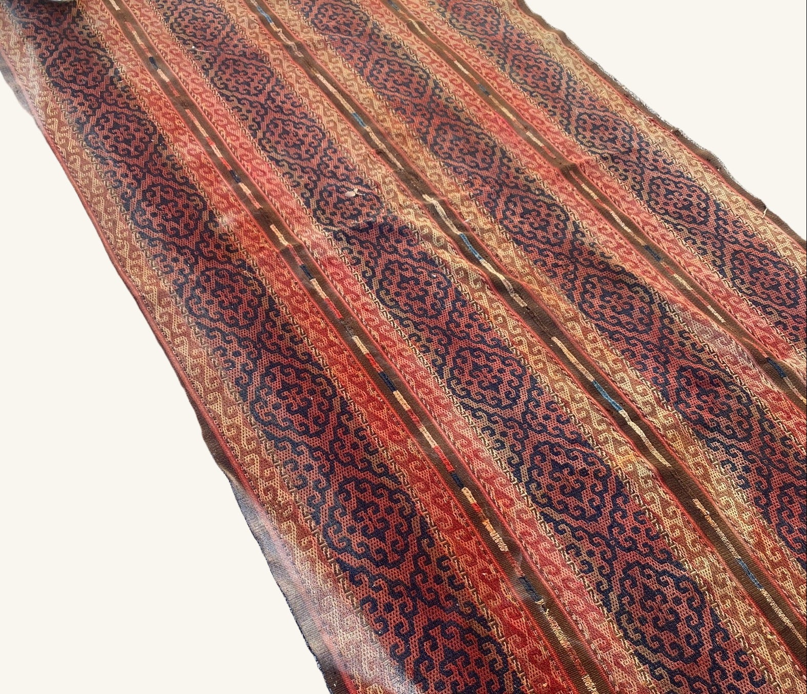 This rug is an imported vintage piece from Afghanistan. Has some fading & small holes.